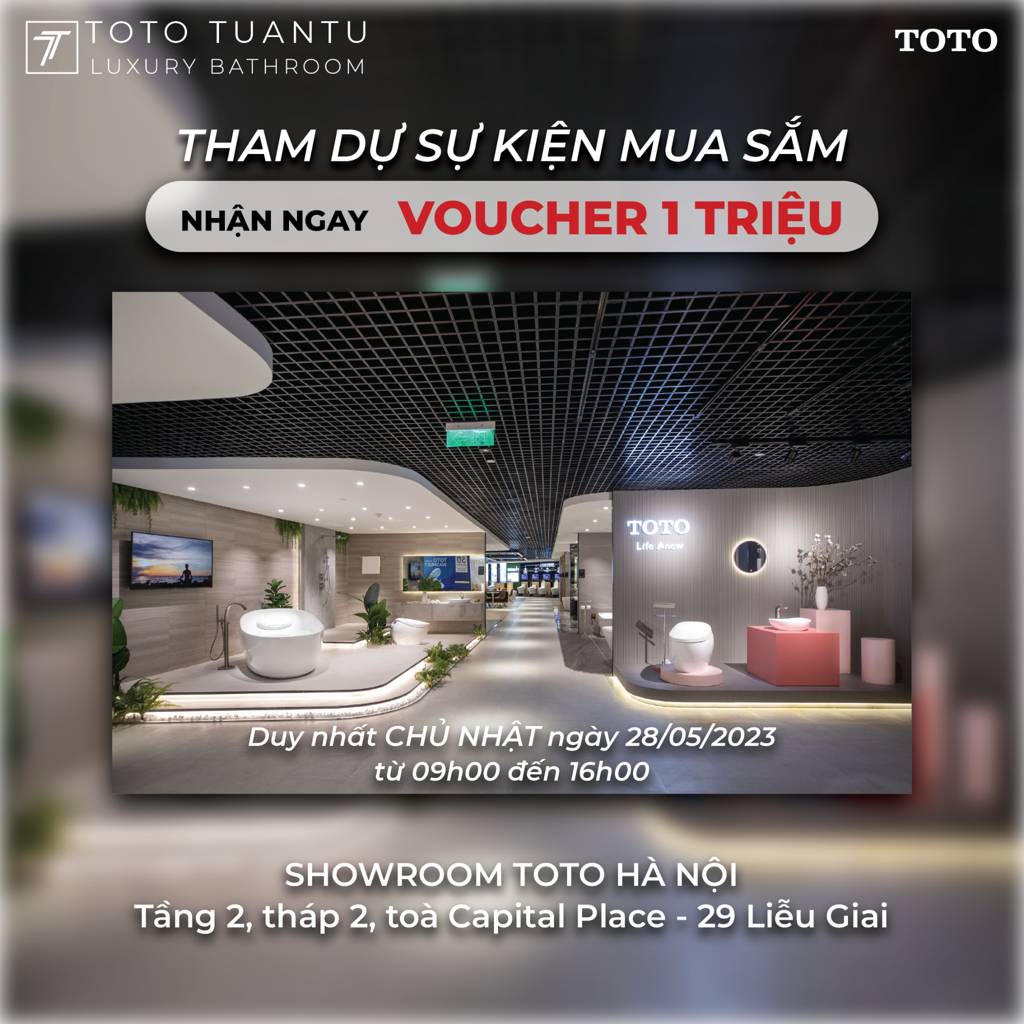 Đặc biệt nhận ngay Voucher 1 TRIỆU ĐỒNG cùng các ưu đãi khác khi đăng ký tham dự sự kiện mua sắm“ CHÀO HÈ - TRẢI NGHIỆM KHÁCH HÀNG THÂN THIẾT” của TOTO TUẤN TÚ được diễn ra vào ngày 28/05/2023 từ 9:00 - 16:00 trên Showroom TOTO HN - tầng 2 toà Capital Palace - 29 Liễu Giai, Ba Đình, Hà Nội.